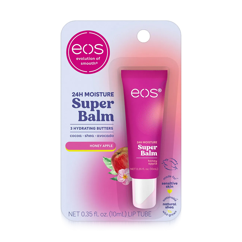 O EOS Super Balm Honey Apple é um bálsamo labial ultra-hidratante desenvolvido para tratar lábios secos, sensíveis ou rachados. Com fórmula rica em três manteigas naturais – cacau, karité e abacate – ele oferece hidratação intensa por até 24 horas, deixando os lábios macios, suaves e protegidos.