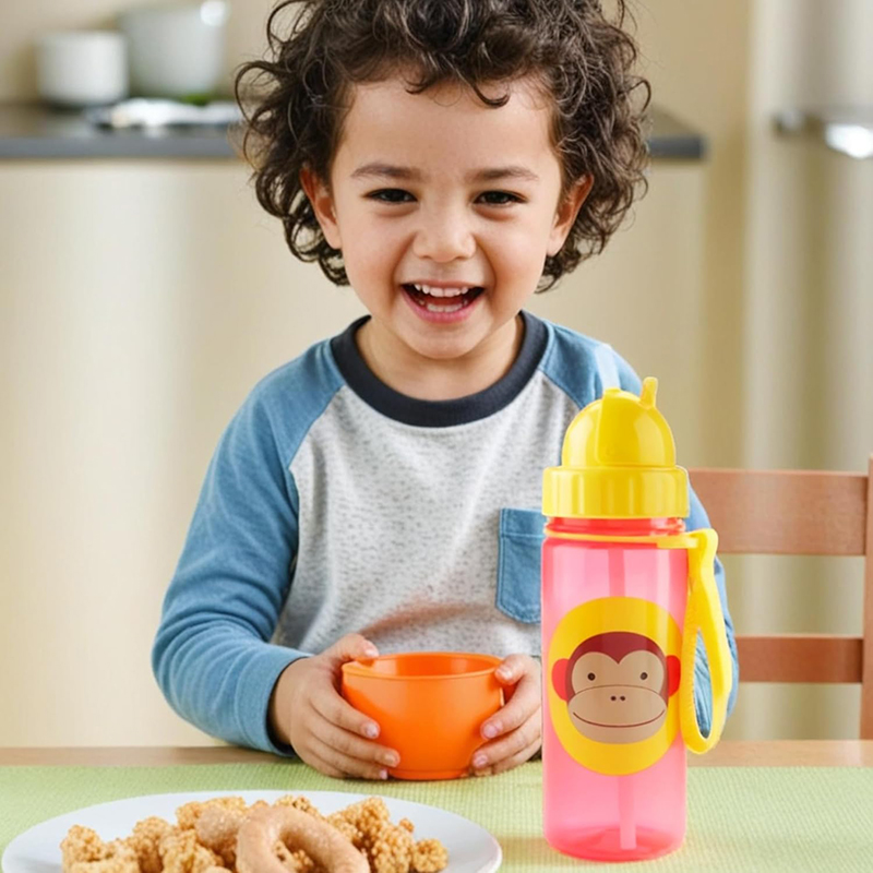 Garrafinha infantil Skip Hop Macaquinho com canudo, tampa flip‑top e alça de transporte. Segura, livre de BPA e perfeita para incentivar autonomia no dia a dia. Capacidade para 390 ml.