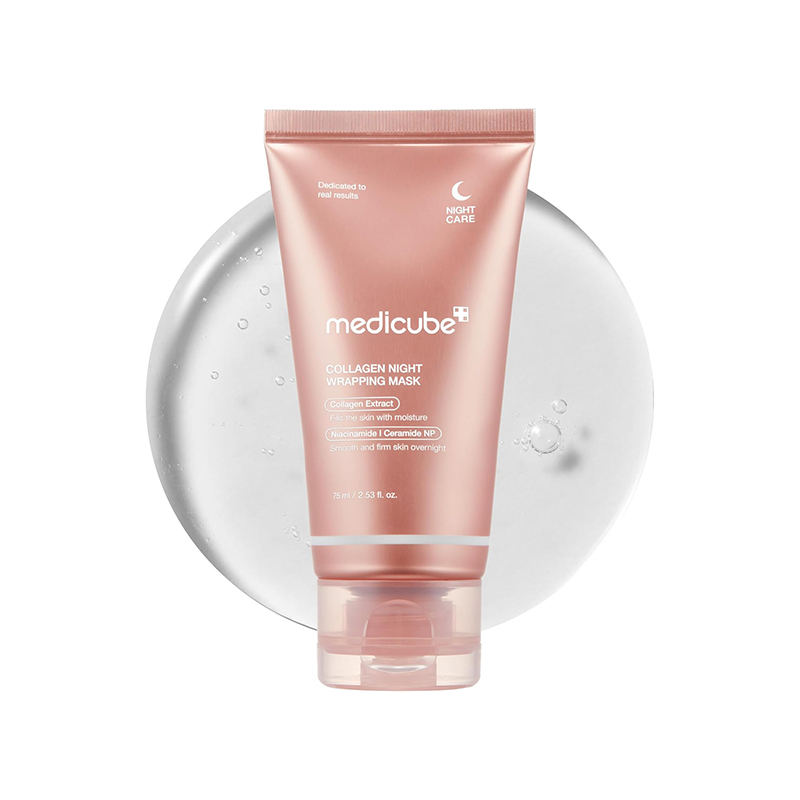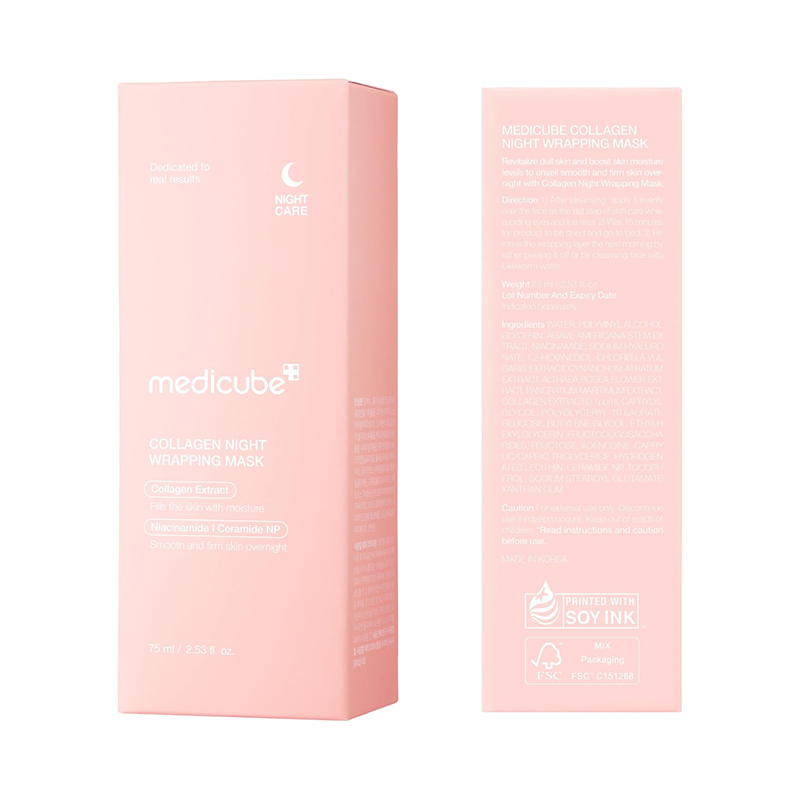 Máscara noturna Medicube Collagen Night Wrapping Mask. Com colágeno, niacinamida e ceramida para firmeza, hidratação e textura renovada. Pele mais macia e luminosa ao acordar. Produto original.