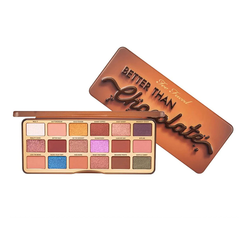 A Better Than Chocolate é uma das paletas mais icônicas da Too Faced — e esta versão especial traz 18 tons exclusivos, com nomes e cores que não aparecem na edição tradicional. São sombras super pigmentadas, com infusão de cacau, textura amanteigada e acabamentos que vão do matte ao metálico, shimmer e glitter.