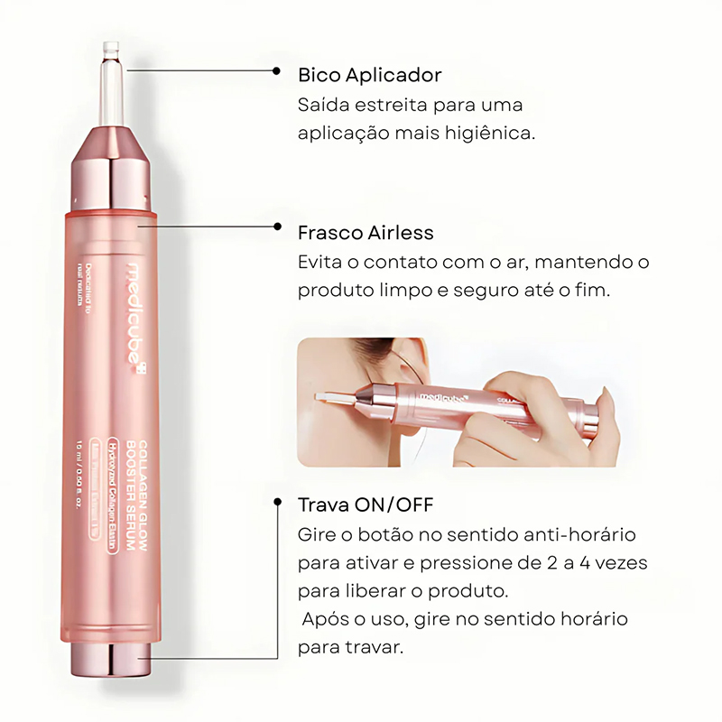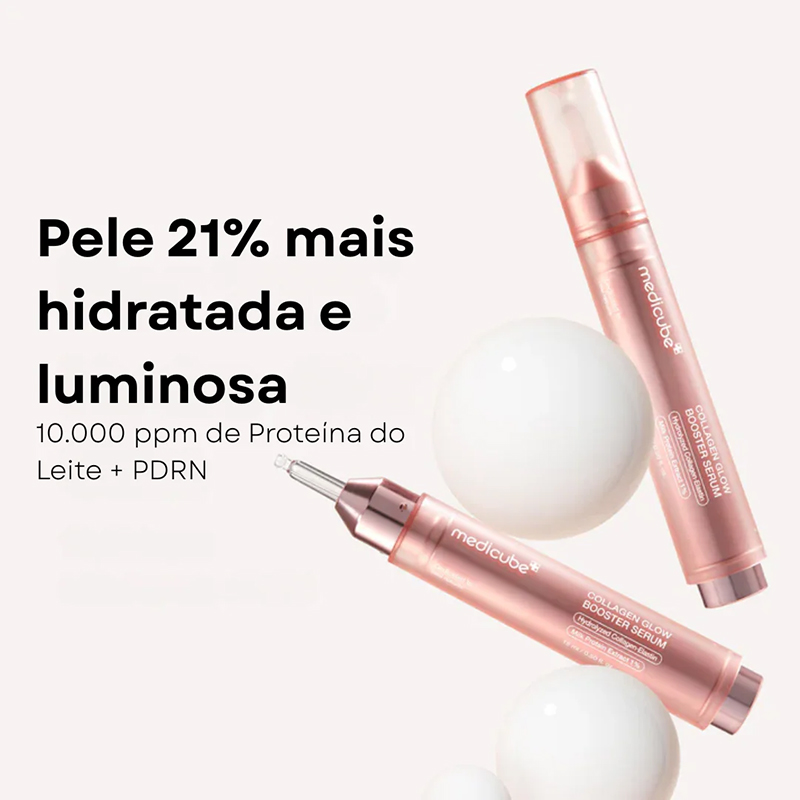 O Collagen Glow Booster Serum da Medicube é um sérum portátil e de alto desempenho desenvolvido para quem busca uma pele radiante, hidratada e com textura mais uniforme. Sua fórmula combina Niacinamida, Colágeno Hidrolisado, Elastina e Extrato de Proteína do Leite 1%, ativos reconhecidos por melhorar a elasticidade, suavizar linhas finas e promover um glow natural.